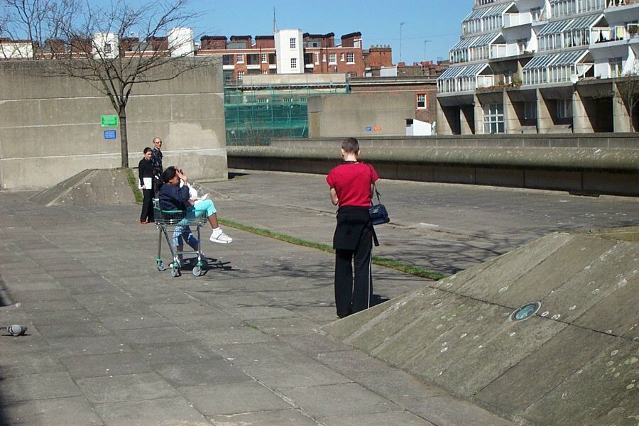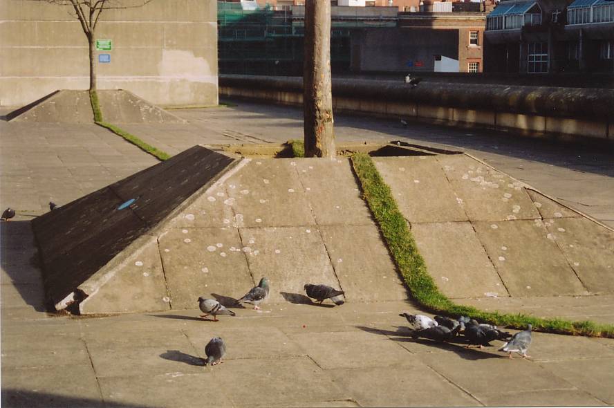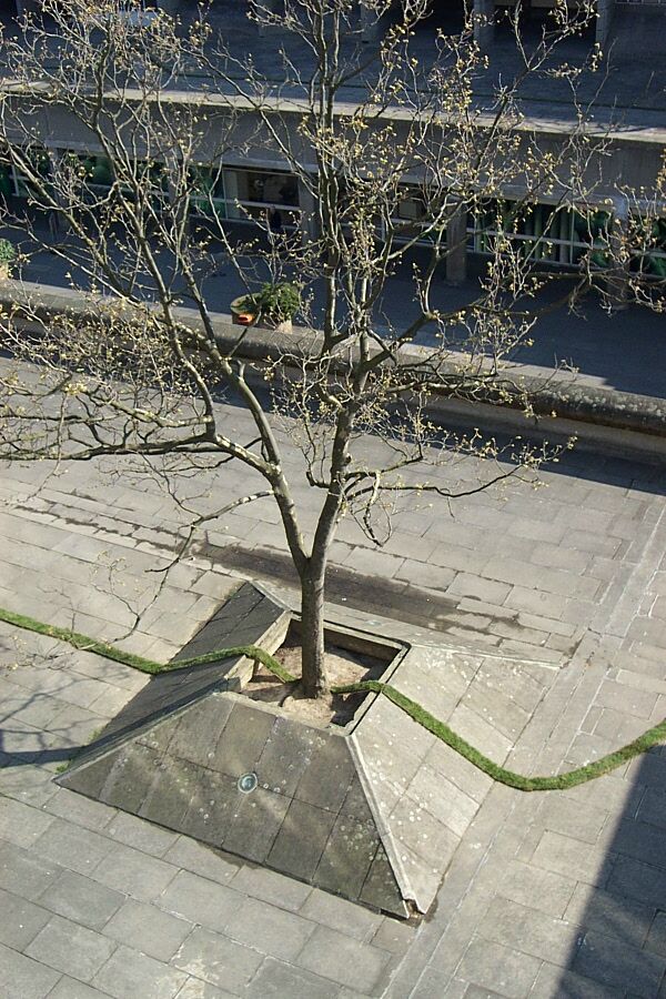 A line of grass winds through the concrete, connecting the isolated trees and creating a subversive alternative pathway