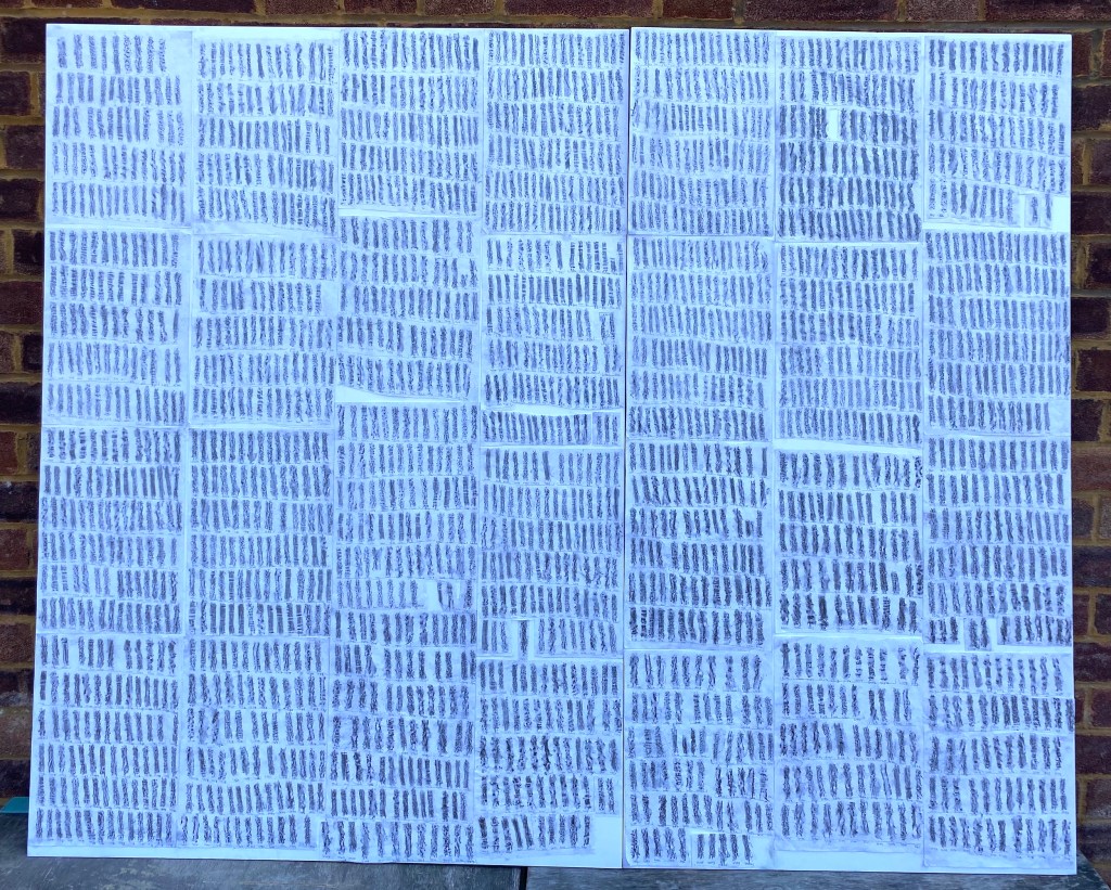 In this long-term project, started during lockdown in 2020, I visited each of the 2,222 street trees in my postcode area of SE15. Spending a moment with each tree, I took a small bark rubbing on paper. These marks were assembled to create a large-scale “map” of the area’s urban forest at the time of making.