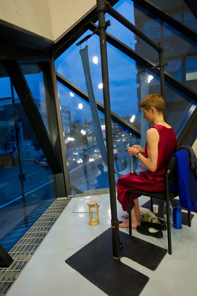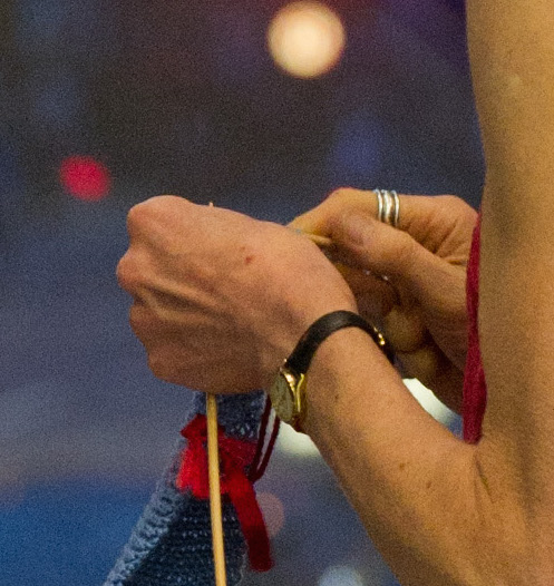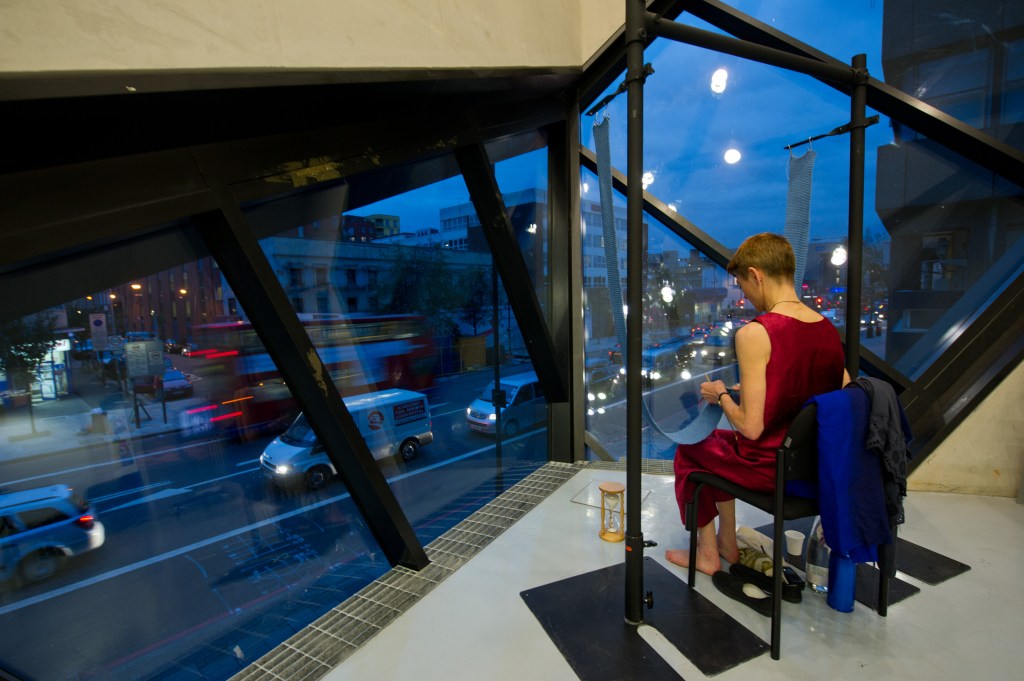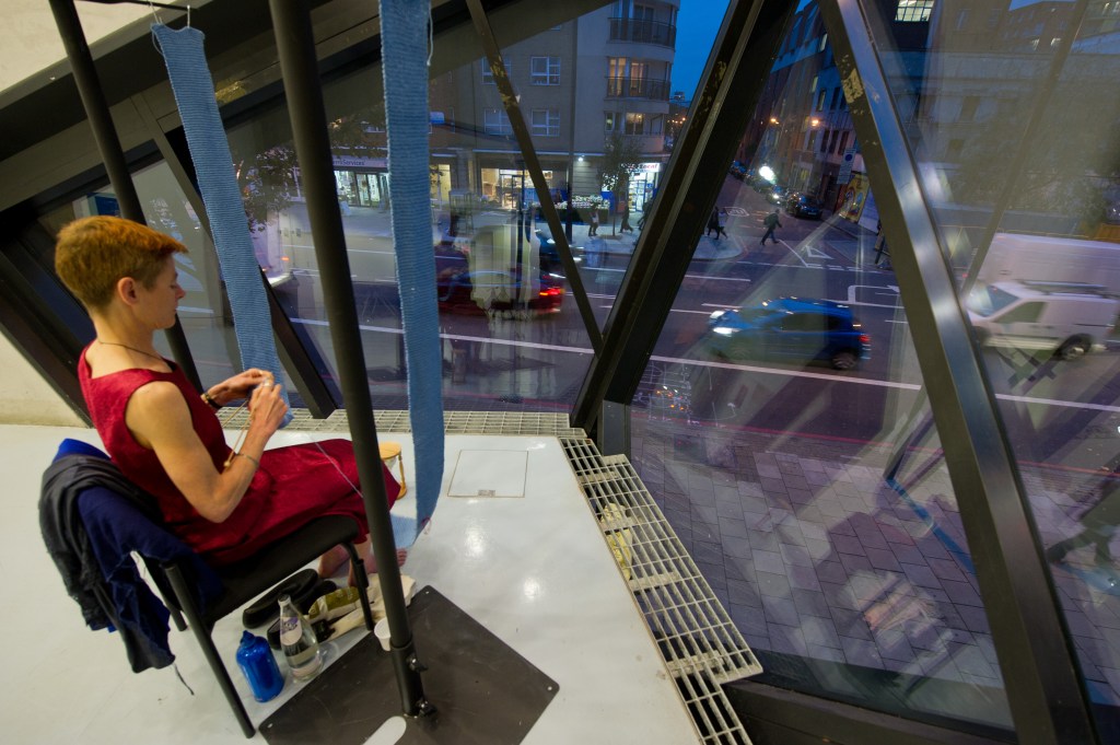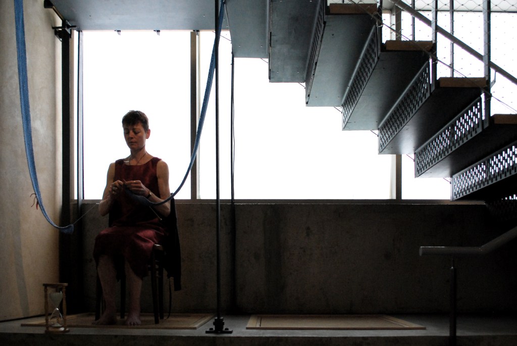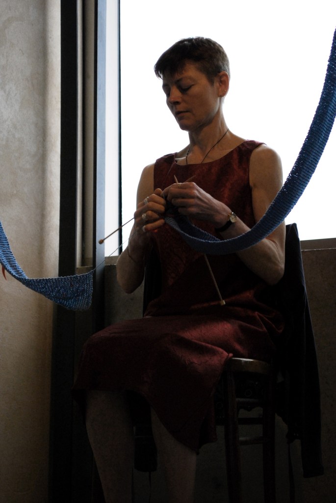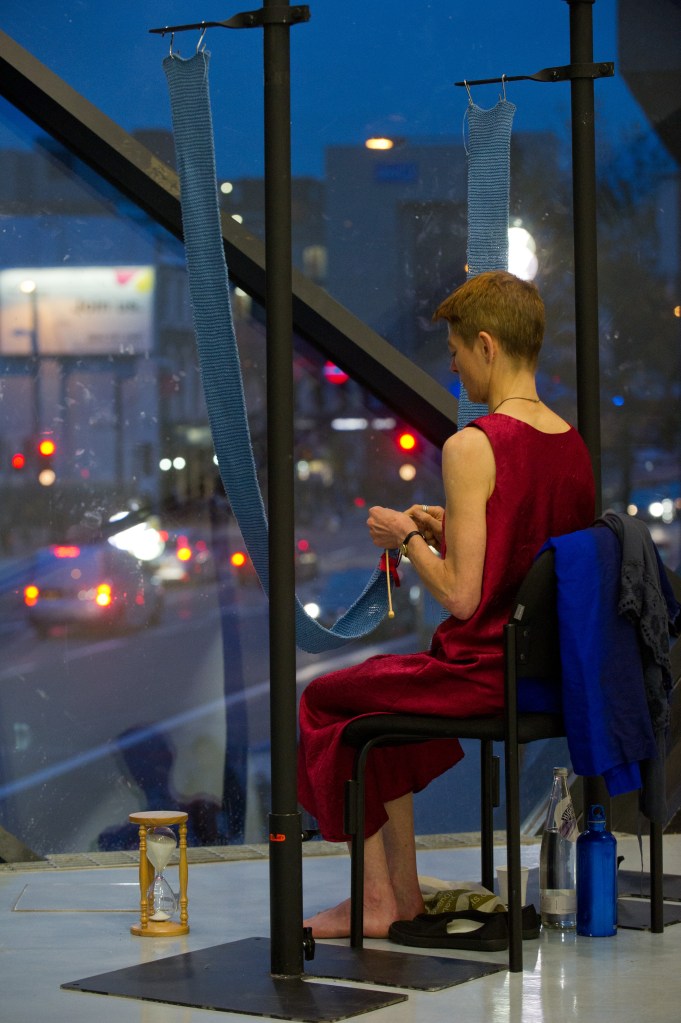 I sit between two strips of knitting, joined by a length of yarn. As I knit one side grows while the other unravels. Each hour, marked by the hourglass, I switch direction, unravelling the first side and increasing the second. Through the repeated knitting and unravelling, the yarn in the middle becomes more and more frayed as my fingers and eyes gradually tire and become stiffer.