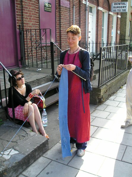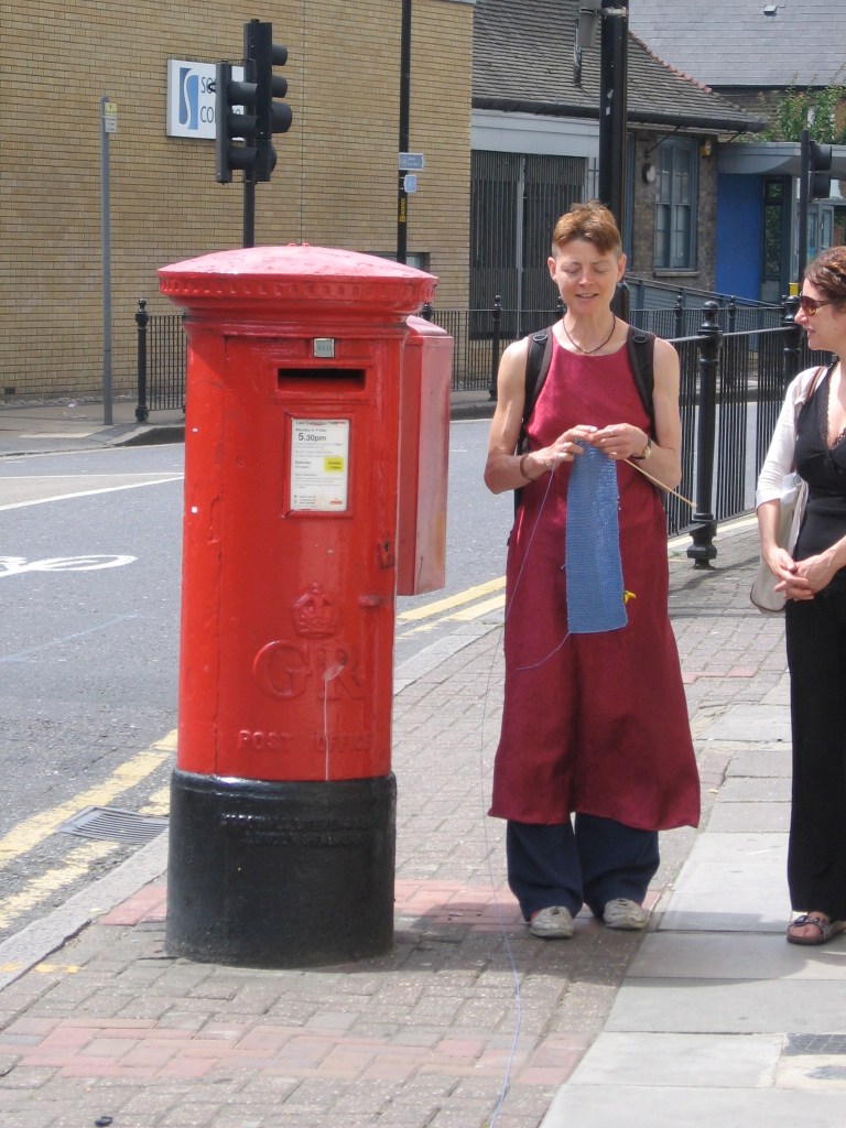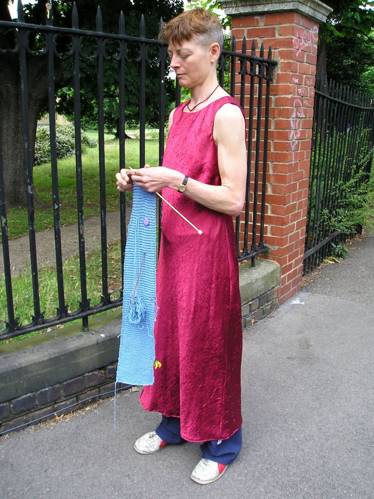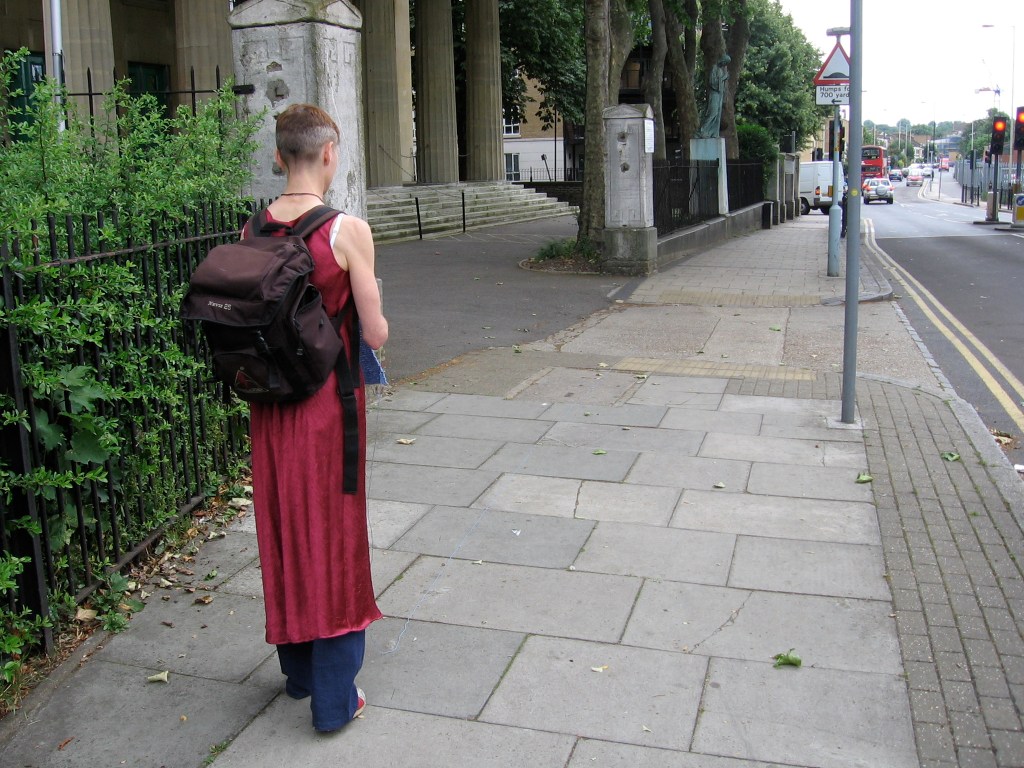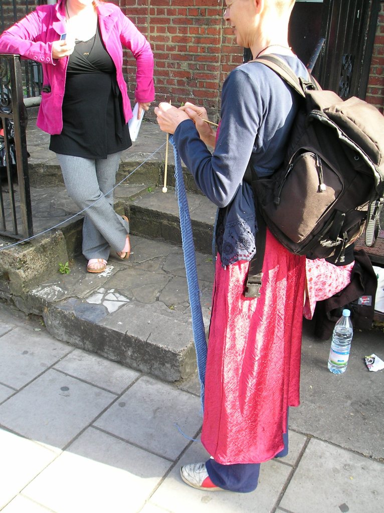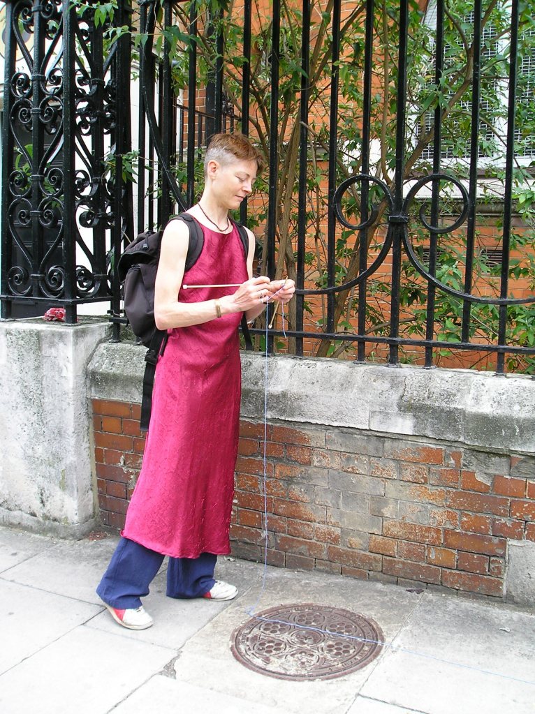 Site-specific durational performance. I lay a line of blue yarn along a route through the streets of south-east London, linking sites historically connected with water (the old bath house, the filled-in canal, the historic healing well of Camberwell). I retrace my steps, knitting it up and collecting stories and small found items into my knitting.