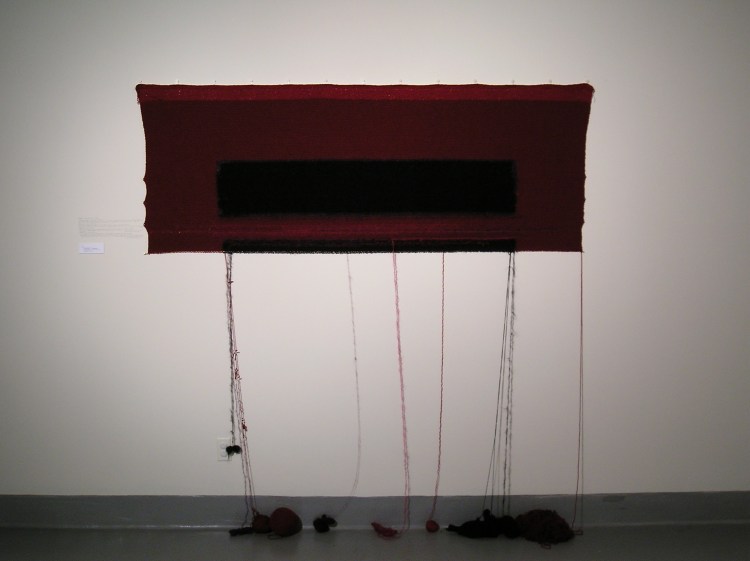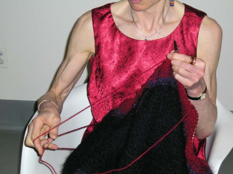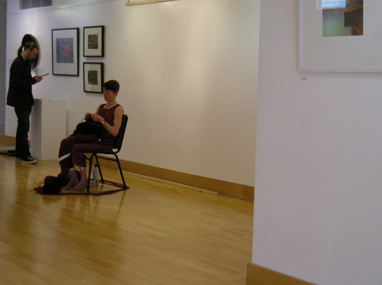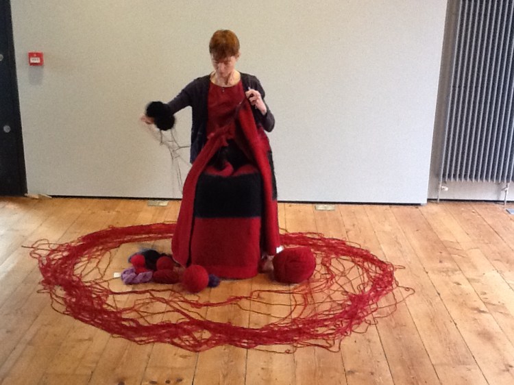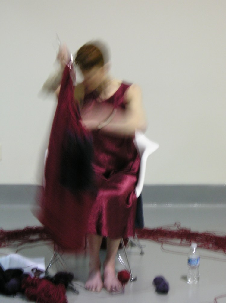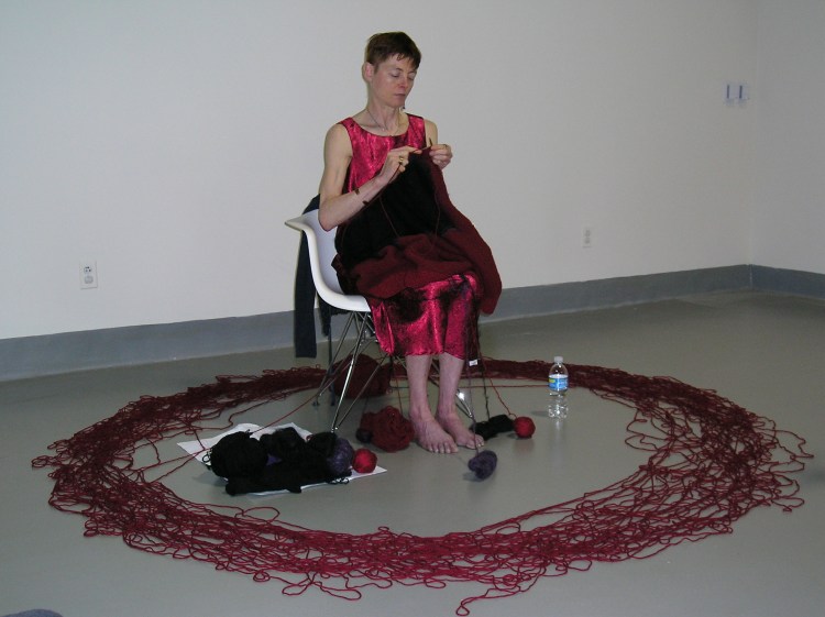 Durational performance and cumulative textile. I sit in a gallery space, surrounded by a sea of yarn. Through periods of several hours, I knit to continue adding to a 2-m wide panel echoing one of Mark Rothko’s paintings. After each performance the textile is hung in the space, its unfinished edge trailing yarn and suggesting its future continuation.